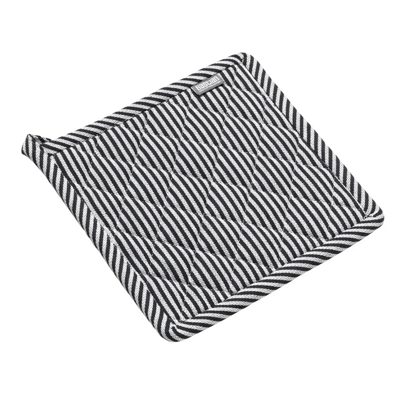 En lækker grydelap med striber i natur og sort lavet i 100% ren ny STANDARD 100 OEKO-TEX bomuld. En god grydelap er uundværligt i ethvert køkken, når der skal tage varme fade eller gryder ud af ovnen.