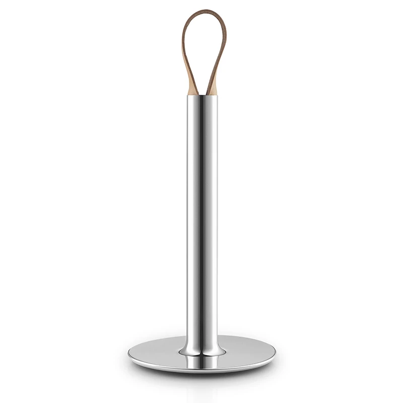 Stilren køkkenrulleholder i rustfrit stål med lækker læder detalje.