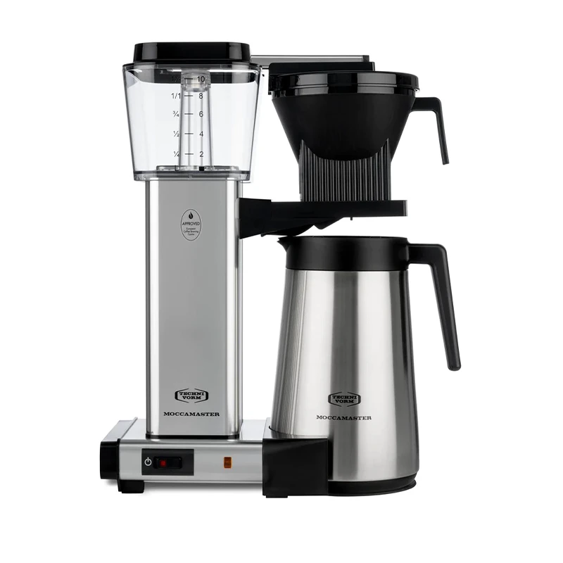 Den stilrene Moccamaster Automatic Thermo er i alt sin enkelthed ret så pæn at se på, og med automatisk drypstop gør kaffemaskinen bryggeprocessen nem for dig. Når du trækker stål termokanden væk fra maskinen, vil den automatisk stoppe med at dryppe fra filterbeholderen. Kaffemaskinen har to separate varmelegemer: den ene brygger kaffen ved 92-96°C som er den perfekte bryggetemperatur, og det andet holder kaffen varm ved den optimale serveringstemperatur på 80-85°C. Er du på jagt efter en kaffemaskine, der brygger en fabelagtig kop filterkaffe direkte ned i en termokande? Så er denne Moccamaster kaffemaskine et rigtig godt bud.