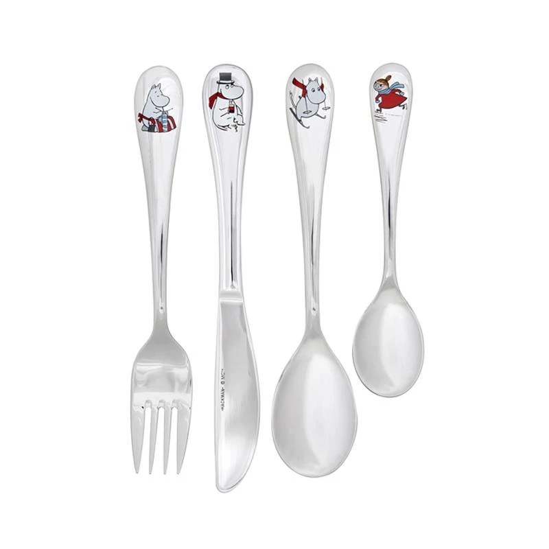 Hyggeligt børnebestik med motiv fra Mumi familen i gang med vinteraktiviteter. Sættet består af kniv, gaffel, ske og teske/ dessertske Fremstillet i rustfrit stål