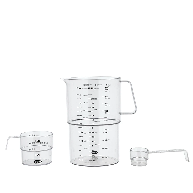 Her får du et lækkert målesæt fra Rösti, som indeholder alt hvad du skal bruge, når der skal måles af til bagværk og madlavning. Sættet består af: 1x måleske (spiseske/teske), 1x decilitermål (1 dl/0,5 dl) og 1x målebæger (1liter/0,5 liter). Alle 3 dele er fremstillet i materialet SAN, som er meget transparent, og er utroligt holdbart.
