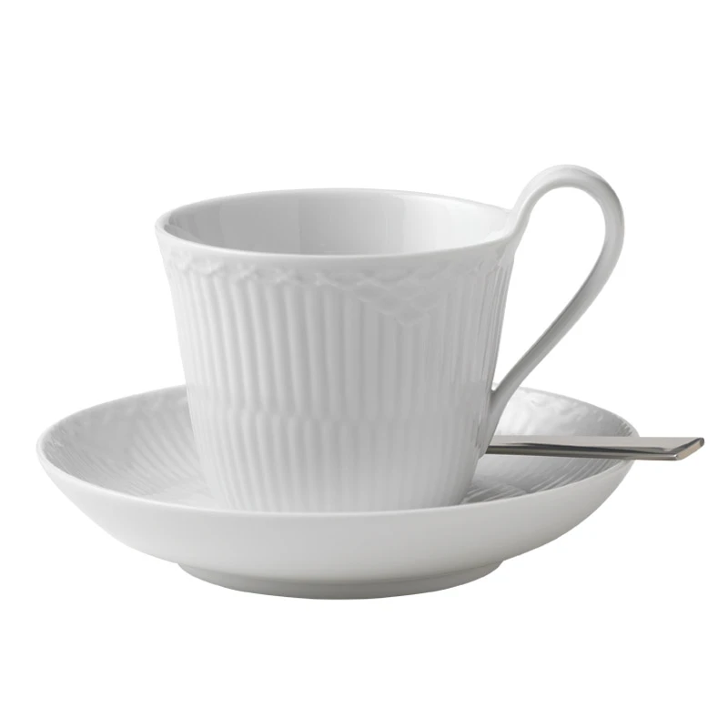 Royal Copenhagen hvid halvblonde højhankskop og underkop 25 cl. I hvid halvblonde har det riflede stel fået tilføjet en ekstra, elegant detalje med halvblonden langs kanten af stellet. Stellet har et smukt romantisk med samtidigt moderne udtryk.