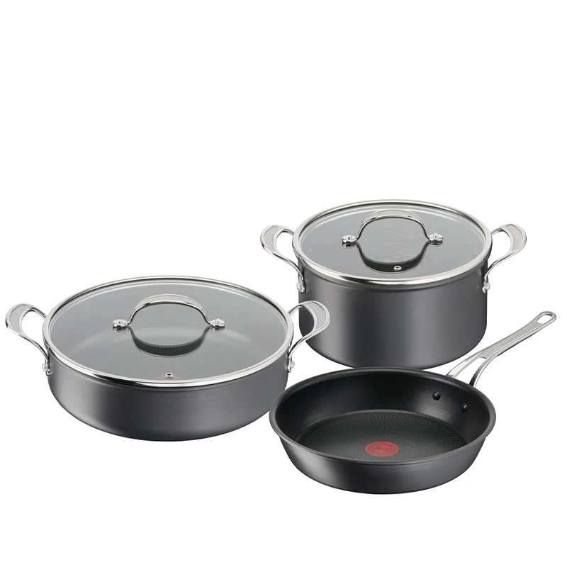 I dette Tefal Jamie Oliver grydesæt får du hele 9 dele. Hard Anodised-serien er produceret i et ekstremt holdbart materiale, der sikrer robusthed samt at panderne og gryderne opvarmes jævnt. Alle gryder og pander er belagt med non-stick så de er nemme at rengøre og ikke kræver store mængder fedtstof, når der skal tilberedes mad. Jamie Oliver siger selv om serien: “Ekstremt brugervenligt kogegrej der kan tilberede alt lige fra lækre laksefileter til den perfekte pandekage mange år fremover”. Alle dele tåler at komme en tur i opvaskemaskinen. Kan bruges på alle typer varmekilder inklusiv induktion. Desuden har alle panderne i serien det velkendte Thermo Signal udviklet af Tefal. Inden du tænder for varmen på din kogeplade, vil du kunne se et lille timeglas inde i det røde Thermo Signal. Når din pande/gryde har den perfekte stegetemperatur, vil timeglasset forsvinde, og du kan stege løs.